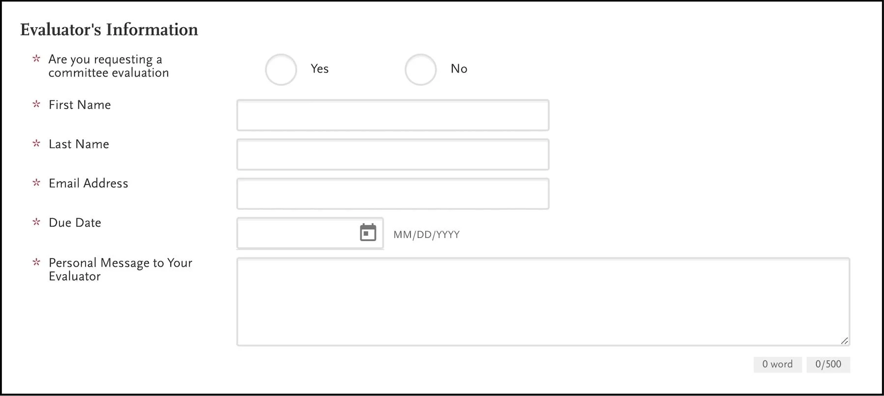 For committee letters, enter the committee chair as the evaluator. This chair will then complete the standardized questions and upload the committee letter through Letters by Liaison (the recommendation service affiliated with AACOMAS).
